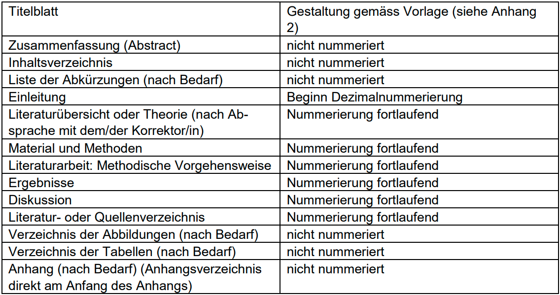 Folgende Gliederung für wissenschaftliche Arbeiten hat sich bewährt und soll grundsätzlich eingehalten werden. Je nach Art oder Thema der Arbeit (z.B. Literaturarbeit, betriebswirtschaftliche Themen u.a.) sind nach Absprache mit den Fachkorrigierenden Abweichungen von dieser Gliederung sinnvoll.
