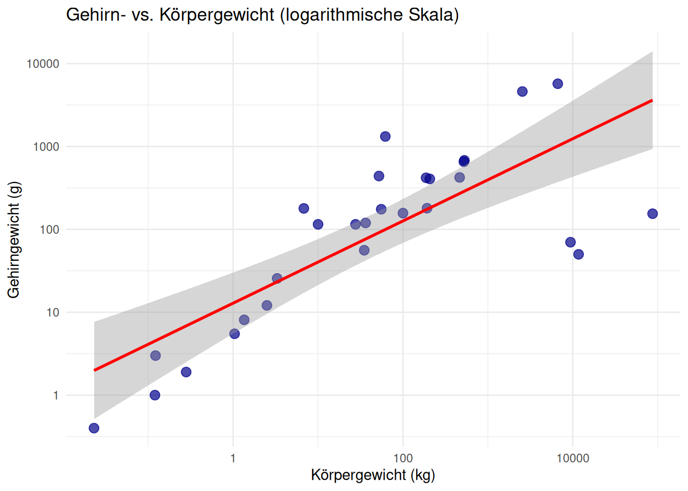 Die logarithmische Darstellung in Abbildung 4.1 visualisiert deutlich die allometrische Beziehung zwischen beiden Variablen. Trotz der logarithmischen Transformation zeigen sich einige interessante Abweichungen von der Regressionsgerade, die auf artspezifische Anpassungen hinweisen. Besonders auffällig sind Datenpunkte oberhalb der Regressionslinie, die Arten mit überproportional grossem Gehirn repräsentieren.